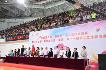 6月16日上午8:00,由中國民辦教育協會學前教育專業委員會主辦,山東銀座·英才幼兒園(集團)(以下簡稱銀座幼教)、北京銀座教育集團承辦,山東省籃球運動協會(以下簡稱省籃協)特別指導的全國第五屆“健康杯”幼兒籃球表演賽暨銀座幼教第十一屆幼兒籃球表演賽于濟南市歷城區體育中心拉開帷幕。來自全國七省市58支代表隊的近1200名幼兒齊聚泉城,參加了本次幼兒籃球盛事。