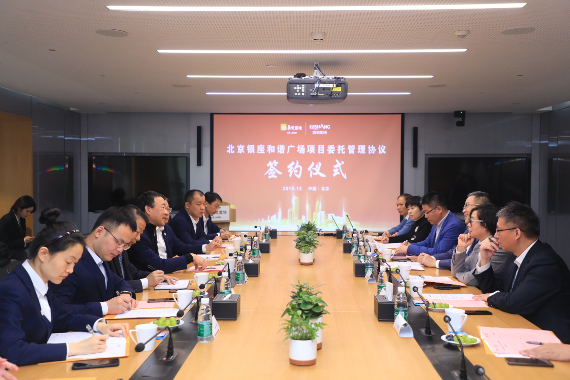 現(xiàn)場(chǎng),在高洪雷、張大為、張建軍、魏小華見證下,雙方簽署北京銀座和諧廣場(chǎng)項(xiàng)目委托管理協(xié)議。