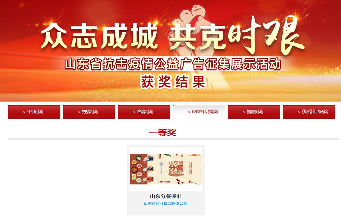 近日,“眾志成城 共克時艱”山東省抗擊疫情公益廣告評選結(jié)果公布,由省商業(yè)集團有限公司(簡稱魯商集團)報送的H5作品《山東版分餐標(biāo)準(zhǔn)來了》,榮獲網(wǎng)絡(luò)傳播類唯一一等獎,這也是省屬企業(yè)唯一的一等獎獲獎作品。