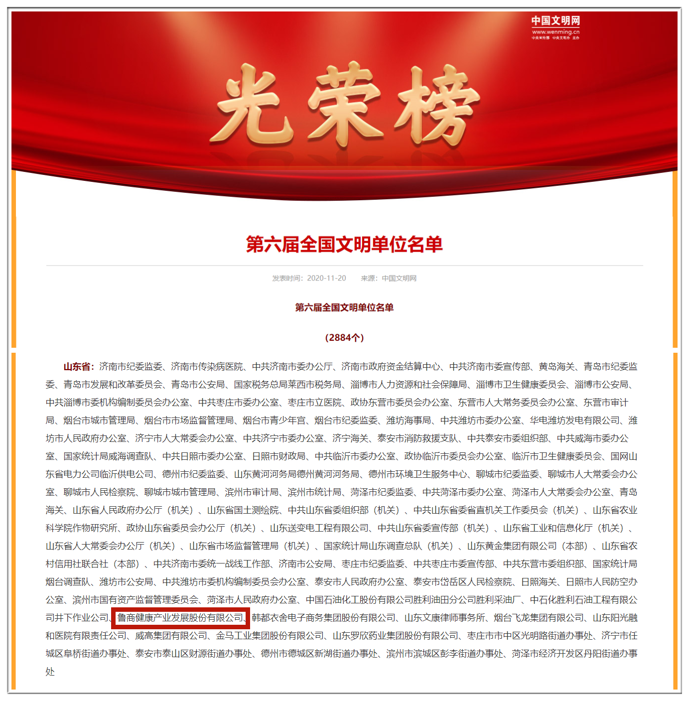 11月20日,中央精神文明建設指導委員會發布了《中央文明委關于表彰第六屆全國文明城市、文明村鎮、文明單位和第二屆全國文明家庭、文明校園及新一屆全國未成年人思想道德建設工作先進的決定》,省商業集團有限公司(簡稱魯商集團)所屬魯商健康產業發展股份有限公司(簡稱魯商發展)被評為第六屆全國文明單位。這是集團內第一家獲此殊榮的單位。