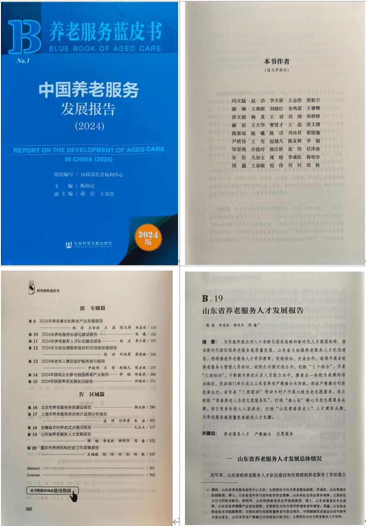 首次出版的《藍皮書》全面總結我國養老服務發展的經驗做法和成果,把養老服務法規、政策、實踐和前沿領域研究成果等向業內外宣傳推廣,進一步推動我國養老服務高質量發展。書中收錄了山東商職學院起草的《山東省養老服務人才發展報告》,其中成立山東省養老產教融合共同體、制定為老志愿服務規范、打造青春養老人品牌、“泰山松”為老志愿服務活動等多項工作作為典型案例進行介紹推廣。
