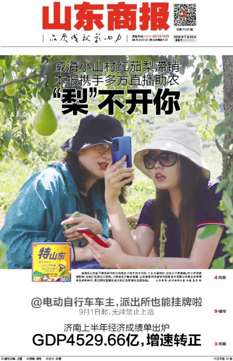 今年以來,山東商報已經累計推出了10多場“特山東”品牌活動,推介了包括平陰泉水櫻桃、商河仁鳳西瓜等品牌在內的農產品。7月28日至31日,頂著高溫酷暑,山東商報記者團隊從濟南趕赴威海乳山崖子鎮棗林村、濰坊安丘市凌河鎮的百鵝疃村,在田間地頭做了兩場直播帶貨活動,為當地滯銷的特色農產品紅茄梨、牛奶小芋頭和紅芽嫩姜找出路。本次活動中,山東商報聯合多家媒體共同出擊,幫助當地農民售出總計20萬斤特色農產品。